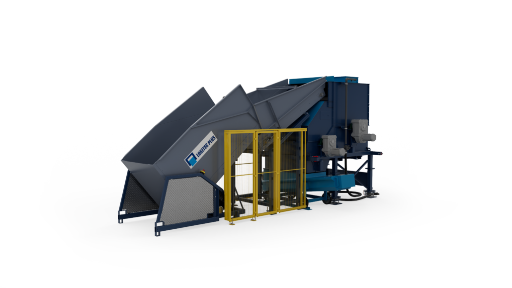 Als je je kokosblokken op pallets ontvangt, kan de CM200 worden uitgerust met een palletinvoerinstallatie die de coco mill automatisch vult. De CM200 is gemonteerd op load cells zodat het min. en max. gewicht kan worden ingevoerd. Hierdoor wordt de CM200 automatisch gevuld met blokken tot het vooraf ingestelde max. gewicht. Bij het verwerken van de blokken daalt het gewicht op de CM200 tot het min. gewicht, waarna hij weer wordt gevuld. Hierdoor kun je de CM200 laten bedienen door de voorlader, nadat deze naar wens is ingesteld.